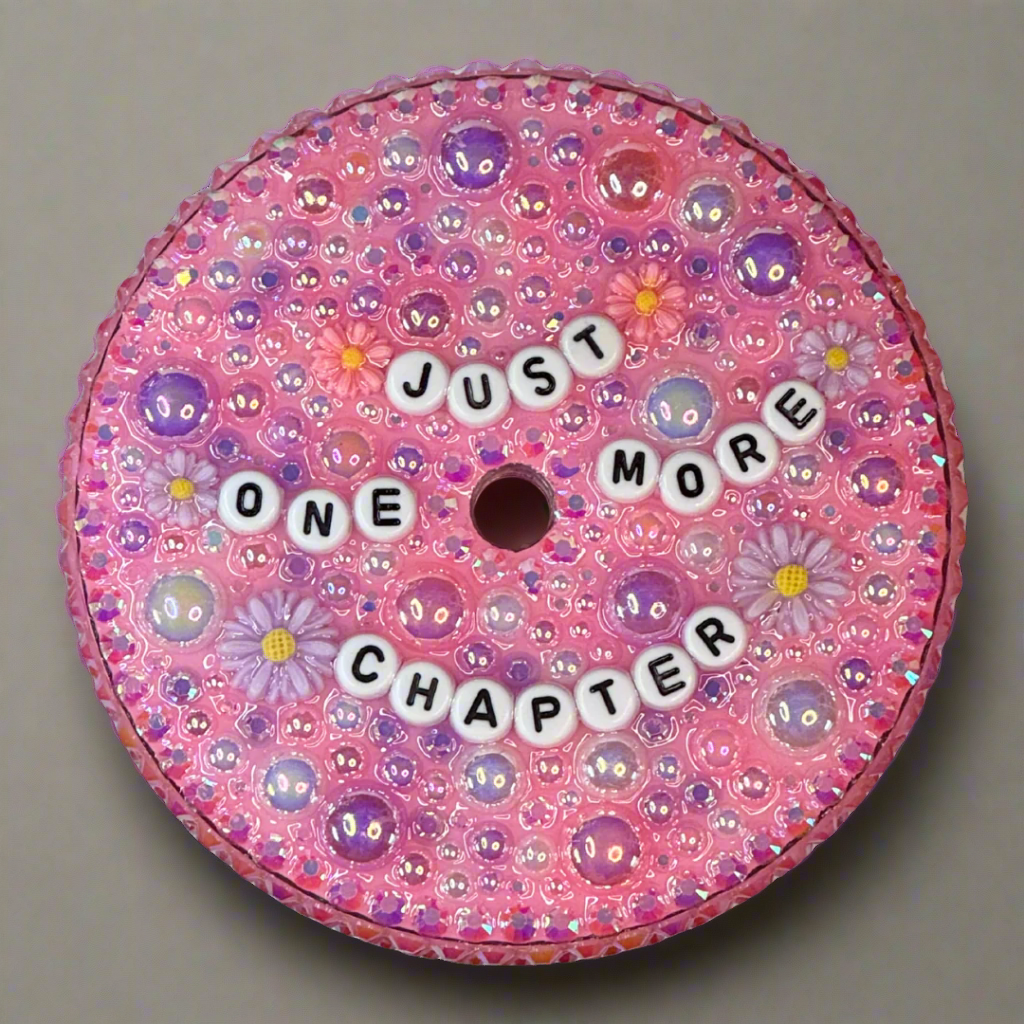 For book lovers who can’t resist one more page! This 24 oz snowglobe tumbler features a sparkling glitter effect with a "Just One More Chapter" wrap. The rhinestone drip lid matches beautifully, complete with embellishments for an extra touch of charm. Includes a reusable straw—perfect for cozy reading sessions!