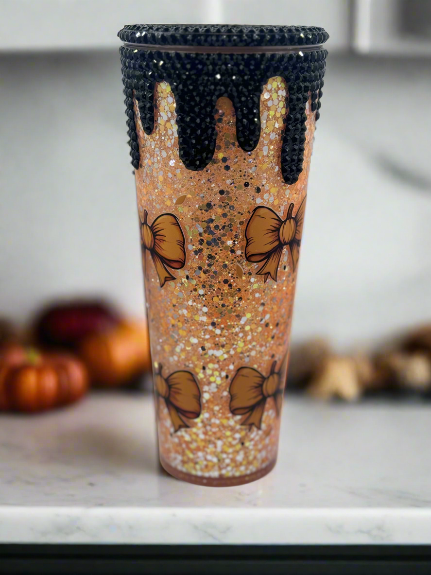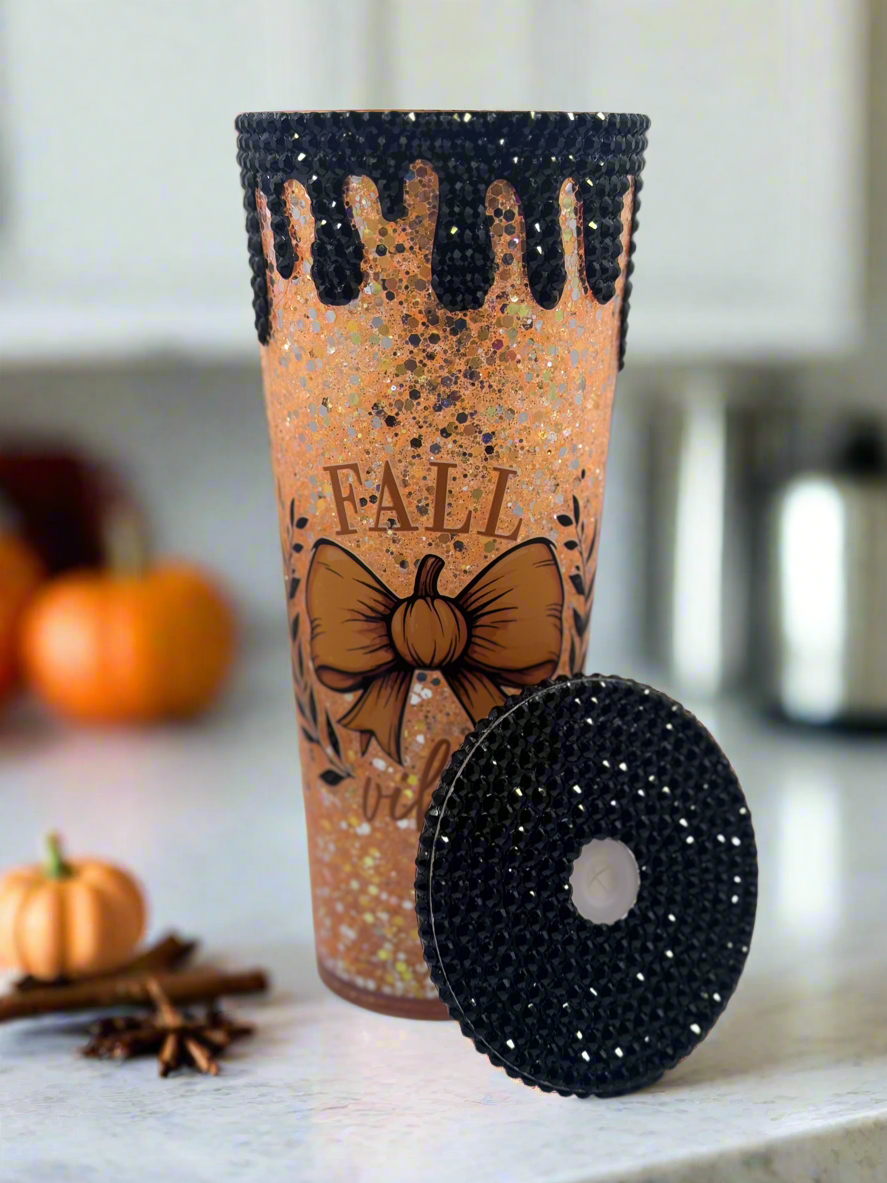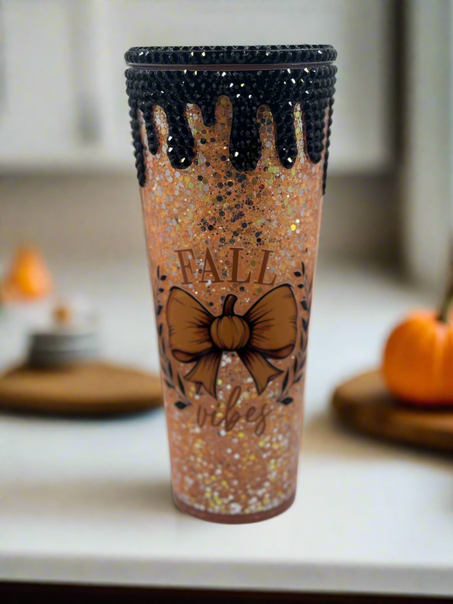 Capture the magic of autumn with our limited-edition "Fall Vibes" snow globe tumbler. This 24 oz tumbler is filled with a stunning orange and silver glitter solution, creating a mesmerizing suspended effect that embodies the beauty of fall. Topped off with a gorgeous black rhinestone-decorated lid and matching drip, this tumbler brings seasonal sparkle to every sip. Plastic straw included.