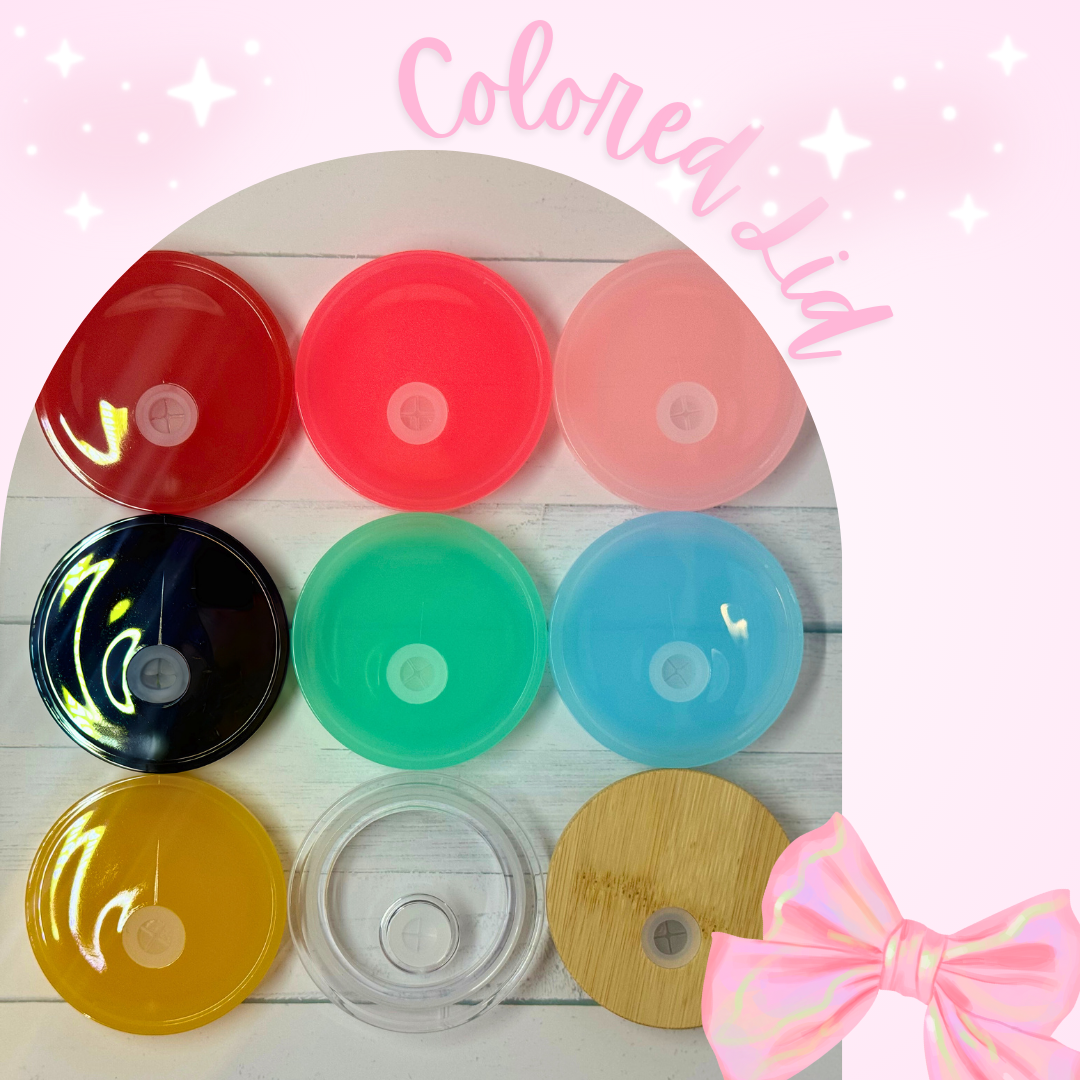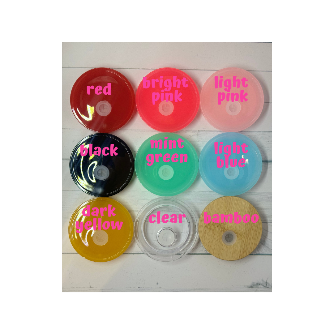 Finish your custom 16 oz glass or plastic tumbler with a different colored lid. Glass orders come with a bamboo lid, and plastic orders include a clear plastic lid at no extra cost. You can upgrade to a colored acrylic lid for a modern touch or add charms to your lid separately for extra personalization.
